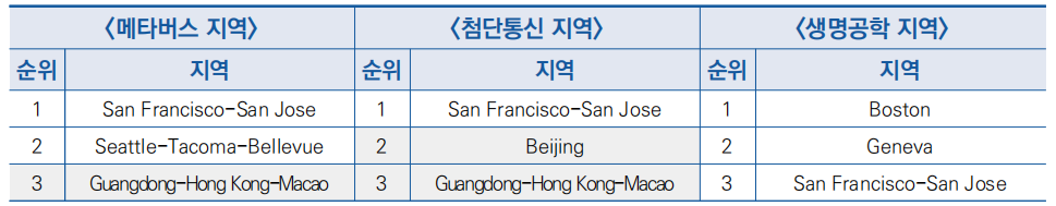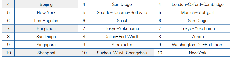 - 베이징은 혁신 선도 기업 수, 유니콘 기업 수, 미래 산업 연간 특허 건수 등 정량적 지표에 따라 종합 지수 90.63점으로 세계 2위를 차지