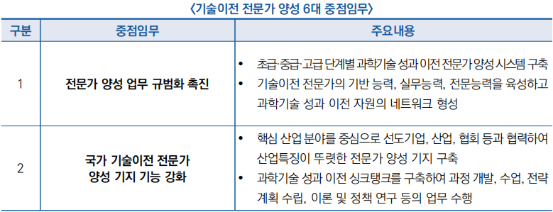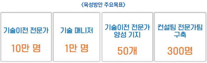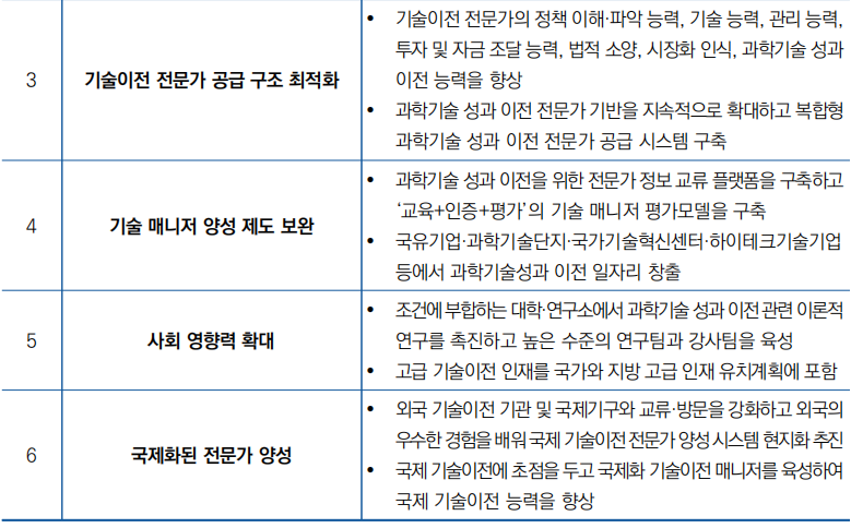 - (전문가 양성 시스템 구축) 각 지방에서 선발된 우수한 강사를 중심으로 과학기술 성과 이전 싱크 탱크를 구축하고, 실습·취업 플랫폼 건설 등 기술이전 전문가 양성 시스템 구축