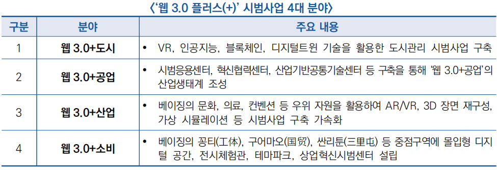 ![]() ○ 도시, 공업, 산업, 소비 4대 분야를 중심으로 ‘웹 3.0 플러스(+)’ 시범사업 구축