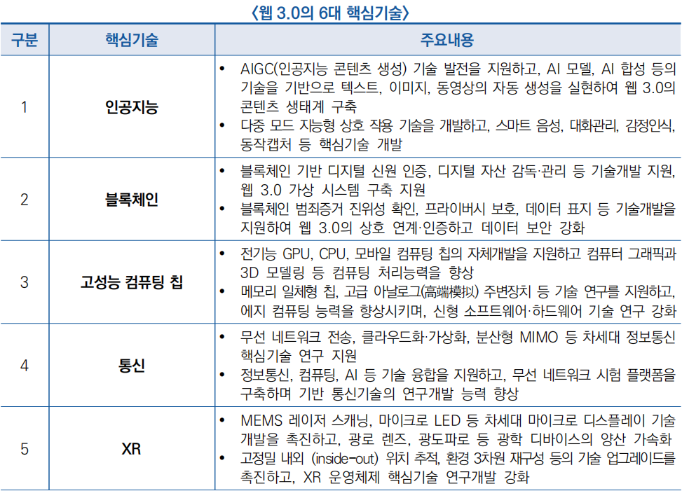 ○ 핵심기술연구로는 인공지능, 블록체인, 고성능 컴퓨팅 칩 등 웹 3.0 관련 6대 기술 강조