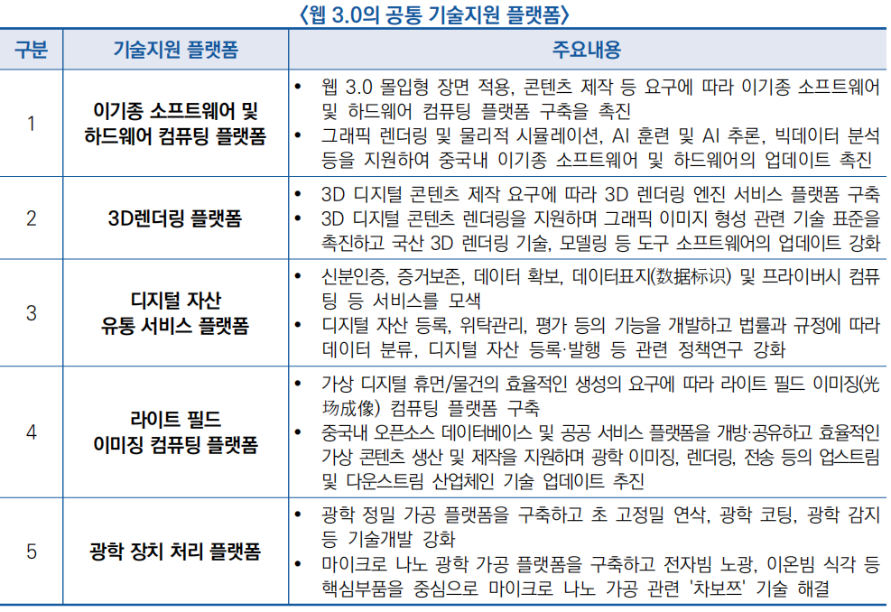 - (주요목표) ’25년까지 웹 3.0 기반 핵심기술 개발 및 국산화, 공통 기술 지원 플랫폼 구축, ‘인터넷 3.0+’ 벤치마킹 시범사업 구축 등을 통해 웹 3.0 기술 혁신 생태계를 조성