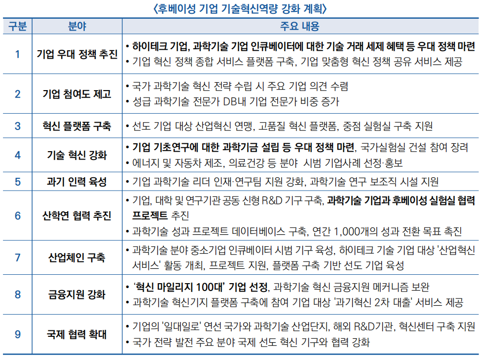- 기업 과학 기술 혁신에 양호한 환경을 조성하고, 과학 기술 혁신 역량을 향상시키도록 지원