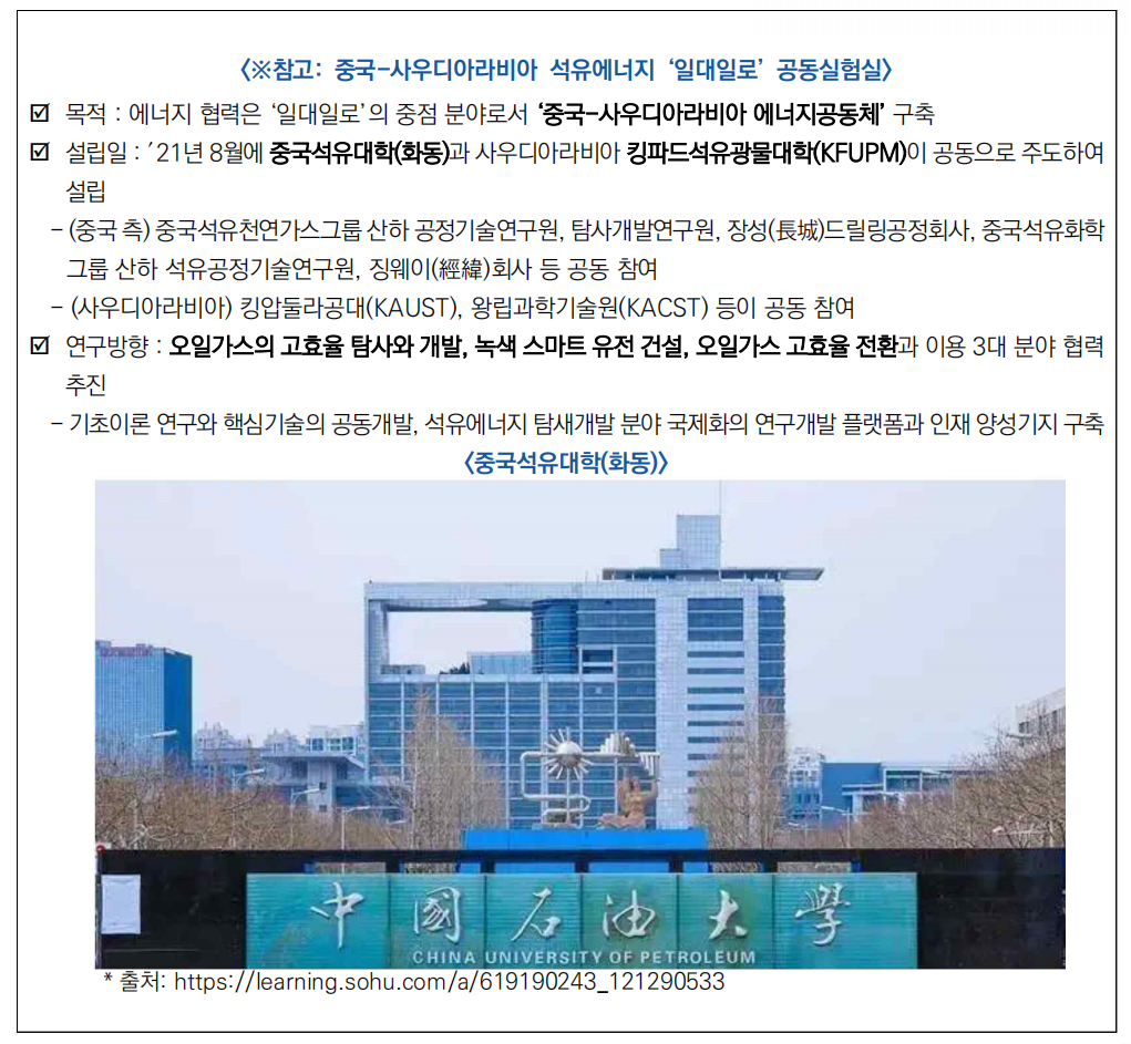 ![]() ○ 그동안 중국-사우디아라비아간 추진한 석유에너지 ‘일대일로’ 공동실험실은 중국 내 석유가스 분야 유일한 국가급 국제공동실험실로서 실용적인 응용기술을 공동으로 개발하여 중국과 사우디아라비아의 유전에 직접 활용할 예정
