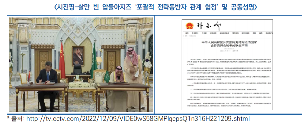 ○ 시주석은 12월 사우디아라비아 방문시 ‘포괄적 전략동반자 관계 협정’을 체결하고, 중국 ‘일대일로’와 사우디아라비아 ‘비전 2030’을 연계하여 에너지․정보통신 등 분야 협력에 합의