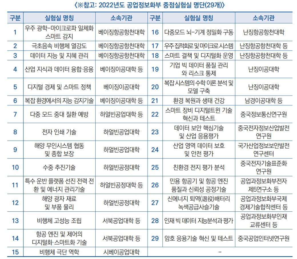 - 2015년부터 시작하여 현재까지 총 7차례 187개의 공업정보화부 중점실험실을 선정하였으며, 그중 2022년도는 총 29개에 달함