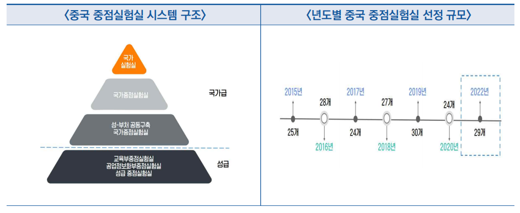 - 중국 ‘중점실험실 시스템’은 국가급과 성급 중점실험실로 나누어 기초·원천기술 개발에 주력