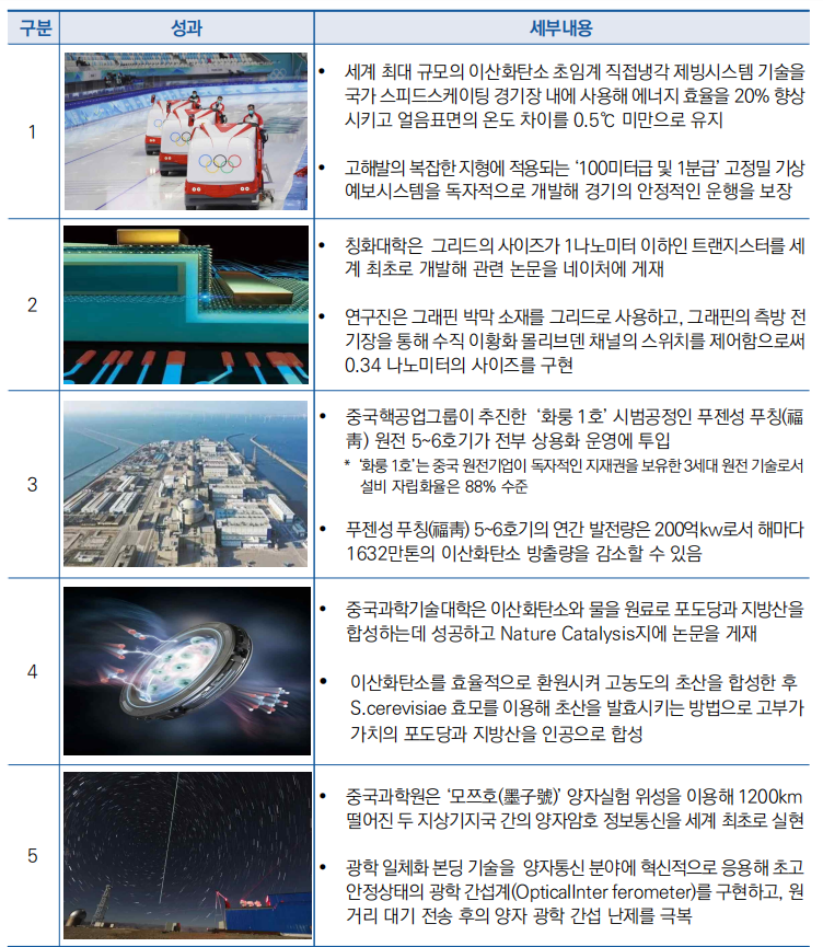 동향 게시판 게시글 제목, 작성일, 조회수, 내용을 포함합니다. 2022년 중국 10대 과학기술 성과 선정 등록일2023.01.10 조회수555 첨부파일 2022년_중국_10대_과학기술_성과_선정.pdf (969.0 KB) □ 과기일보사 주도로 반도체 핵심소자 등 대표적인 과기혁신 이슈 발표(12.19) ○ ′22년 한해 기초연구, 반도체, 원자력, 양자통신, 항공우주 등 다양한 분야에서 성과를 달성 <참고자료> 年终盘点:这一年,科技创新不断塑造新优势 https://mp.weixin.qq.com/s?__biz=MzI2NTA5MTgyNQ==&mid=2651515167&idx=1&sn=c469665d80677c9979ef3504b24f3fe3 목록