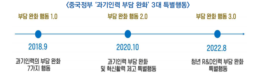 - 이번에 발표된 내용은 세 번째 조치로 중국 과기부・재정부・교육부・중국과학원・자연기금위원회 5개 부처는 청년 R&D인력에 초점을 둔 부담 완화 특별행동 방안을 발표