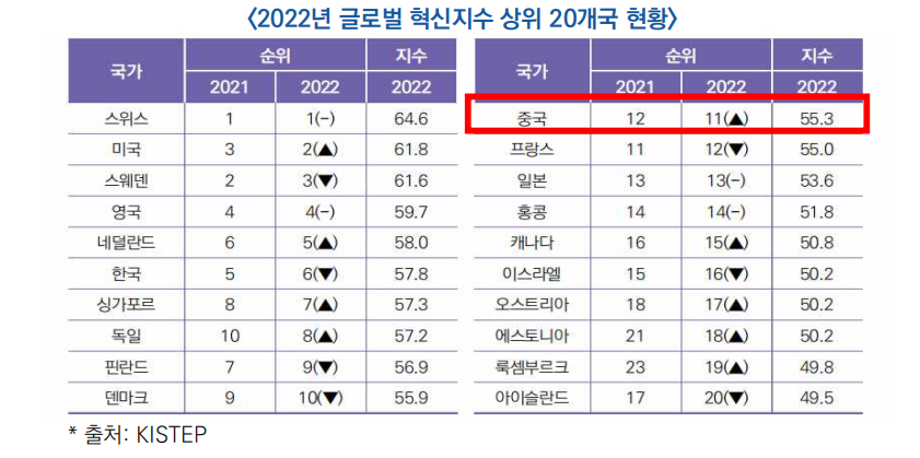 - 세계지식재산기구(WIPO)가 발표한 '2022년 글로벌 혁신지수(GII)'에 따르면 중국은 2020년과 2021년 각각 14위, 12위였으나 2022년에는 11위로 한 계단 상승