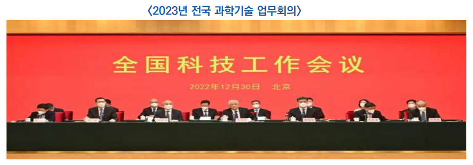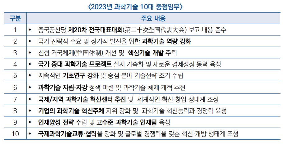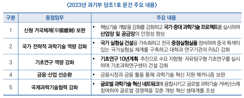 - 과기부는 과학기술 자립·자강 목표 달성을 위한 2023년 당조1호 문건(黨組一號文件)을 제정