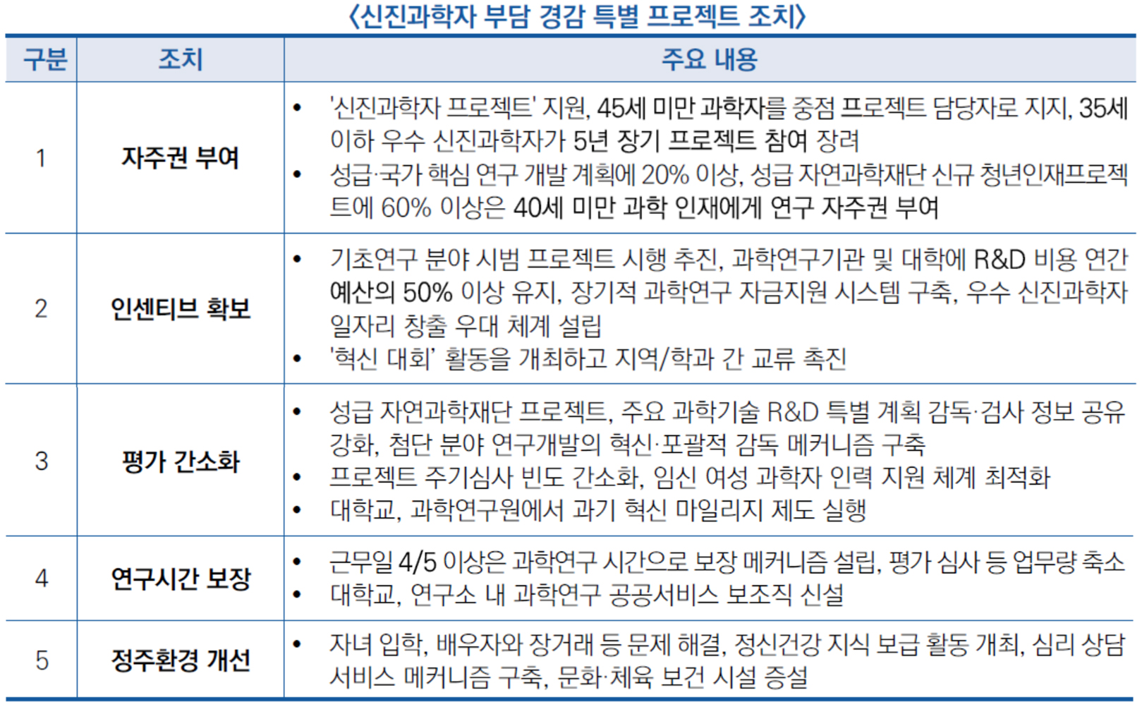 - 주요 특징으로는 청년 과학기술인력의 공급을 제고시키기 위한 청년 과학자 프로젝트 설립을 모색하고, 과기성과 전환에 대한 책임 면제, 긍정적 인센티브 강화 등을 들 수 있음