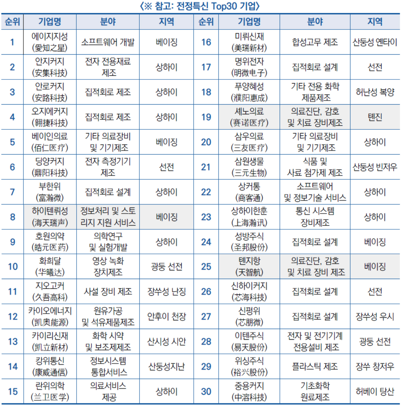 | 중국 전정특신(專精特新) Top30 기업 발표 | ||
