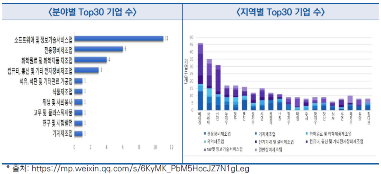 - 지역별로 보면 Top30 기업은 주로 베이징, 상하이, 선전 등 일선 도시(一线城市)에 위치
