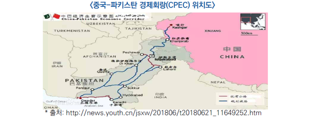 - CPEC는 파키스탄 과다르항에서부터 중국 신장까지 이어지는 도로, 발전소, 경제특구 등 다양한 인프라 개발이 연계된 510억 달러 규모의 대규모 개발사업으로 파키스탄 경제성장의 원동력으로 기대되고 있음