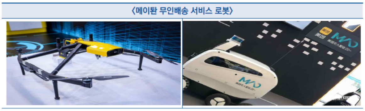 ○ 기술소매 회사인 메이퇀사는 수년동안 로봇 공학분야에 투자해 왔으며, 자율주행 배달차량, 드론, 실내 로봇과 같은 하드웨어 로봇과 소프트웨어 로봇을 독자적으로 개발