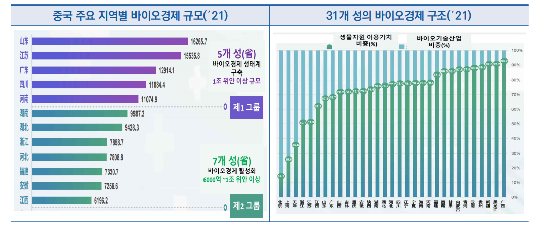 - 바이오기술산업의 비중을 보면 베이징, 상하이, 톈진 순으로 높고, 생물자원 이용가치 비중을 보면 광시, 헤이룽장, 신장 순으로 높음