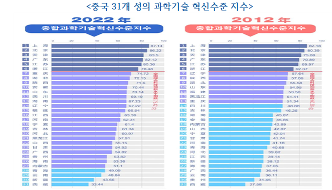 - ′22년 중국 종합 과학기술 혁신수준 지수는 75.42점으로 ′12년 대비 15.14점 증가하였으며 전국 31개 성의 과학기술 혁신수준 지수도 ′12년 대비 모두 상승