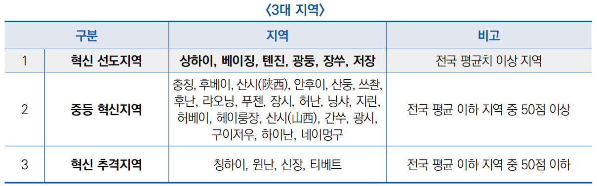 ![]() - 종합 과학기술 혁신수준 지수에 따라 전국 31개 지역은 혁신 선도지역(创新领先地区), 중등 혁신지역(中等创新地区), 혁신 추격지역(创新追赶地区) 등 지역으로 구분