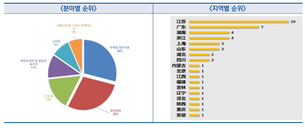 - 분야별로는 차세대 정보기술(13개), 첨단장비(13개), 신소재(7개), 바이오의약 및 첨단의료기기(5개), 소비재(4개), 신에너지 및 스마트 커넥티드카(3개) 순임