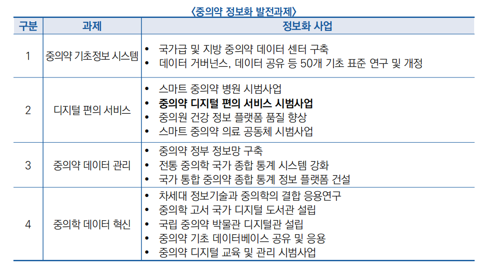 ○ 중의약 정보화 발전계획은 크게 중의약 기초 정보 시스템 강화, 디지털 편의 서비스 최적화 및 중의약 데이터 거버넌스 강화, 데이터 혁신응용 등 4개 주요 과제를 제시