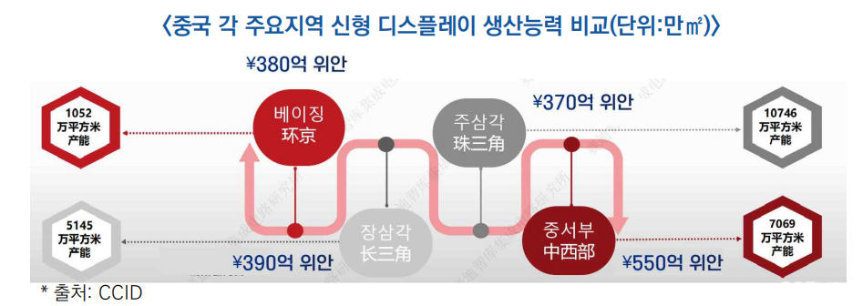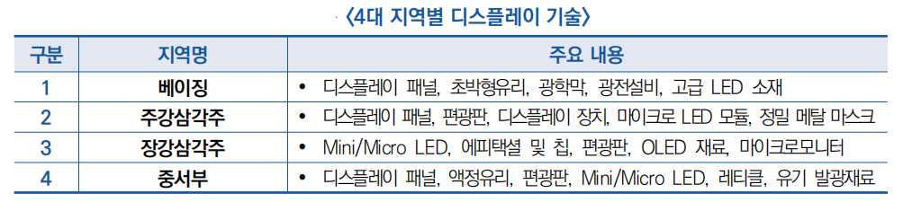 ![]() ○ 지역별로는 중국 신형 디스플레이 산업은 주로 베이징, 장강삼각주, 주강삼각주, 중서부 등 4대 지역에 위치