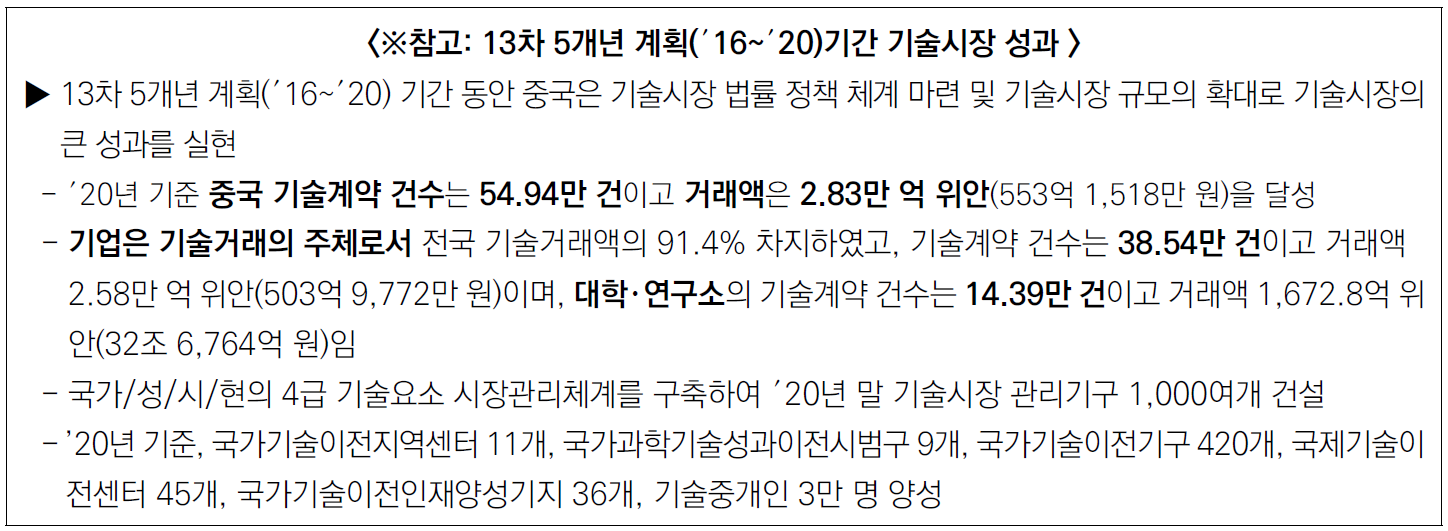 - (중국기술거래소) 지역 간 과학기술 성과 및 지식재산권 거래정보 공유를 지원하고 베이징증권거래소와 기술거래시장・자본시장 협동 메커니즘 구축
