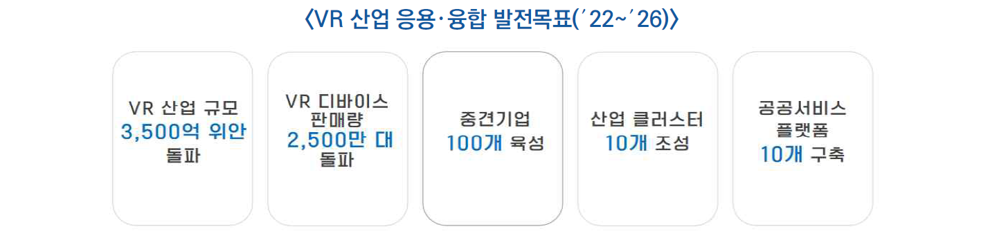 - 혁신 중견기업 100개 육성, 지역 VR 생태계 발전을 선도할 수 있는 클러스터 10개 조성, VR 산업 공공서비스플랫폼 10개 구축