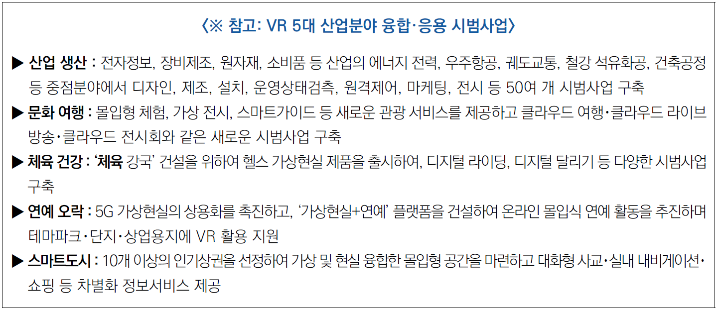 - ‘VR+’ 융합・응용 선도 도시・시범단지 10개 육성, 최소 20개 이상의 특정 시범사업 및 100개 성공사례 구축
