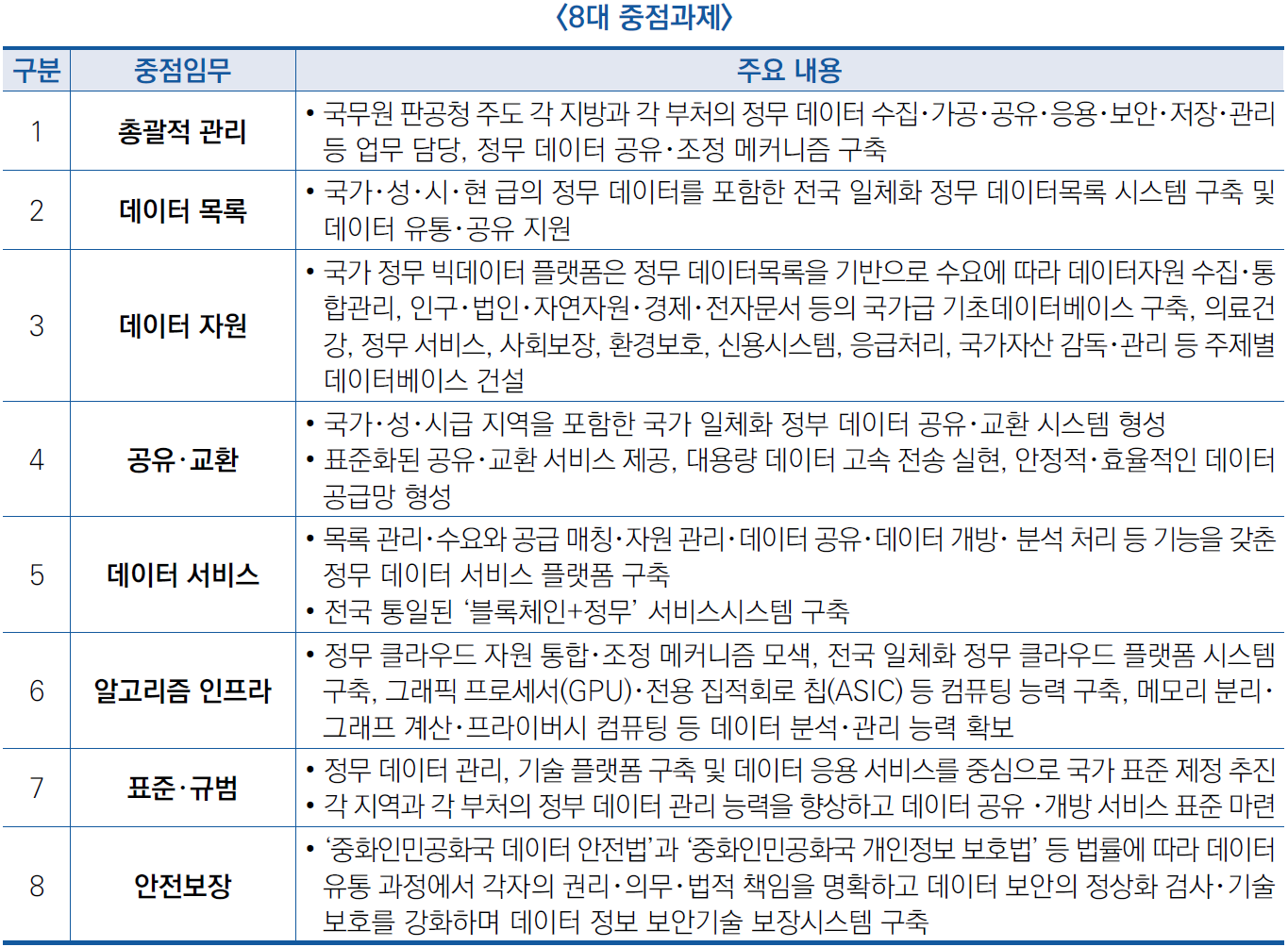 ○ 주요 내용으로 총괄적 관리, 데이터 목록, 데이터 자원, 공유・교환 일체화 등 8대 중점과제 제시