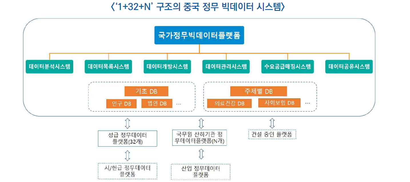 * 1+32+N: ‘1’은 국가 정무 빅데이터 플랫폼, ‘32’는 31개 성(자치구)과 신장생산건설병단(新疆生产建设兵团) 등 성급 정무 데이터 플랫폼, ‘N’은 국무원의 각 산하 기관 정무 데이터 플랫폼을 의미함