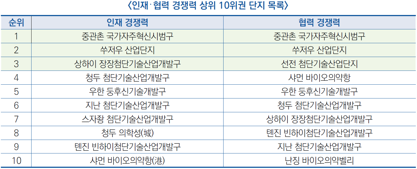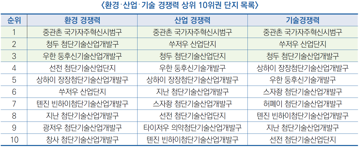 ○ 중관촌 국가자주혁신시범구, 쑤저우 산업단지, 청두 첨단기술산업개발구 순으로 종합경쟁력 상위 3위권을 차지
