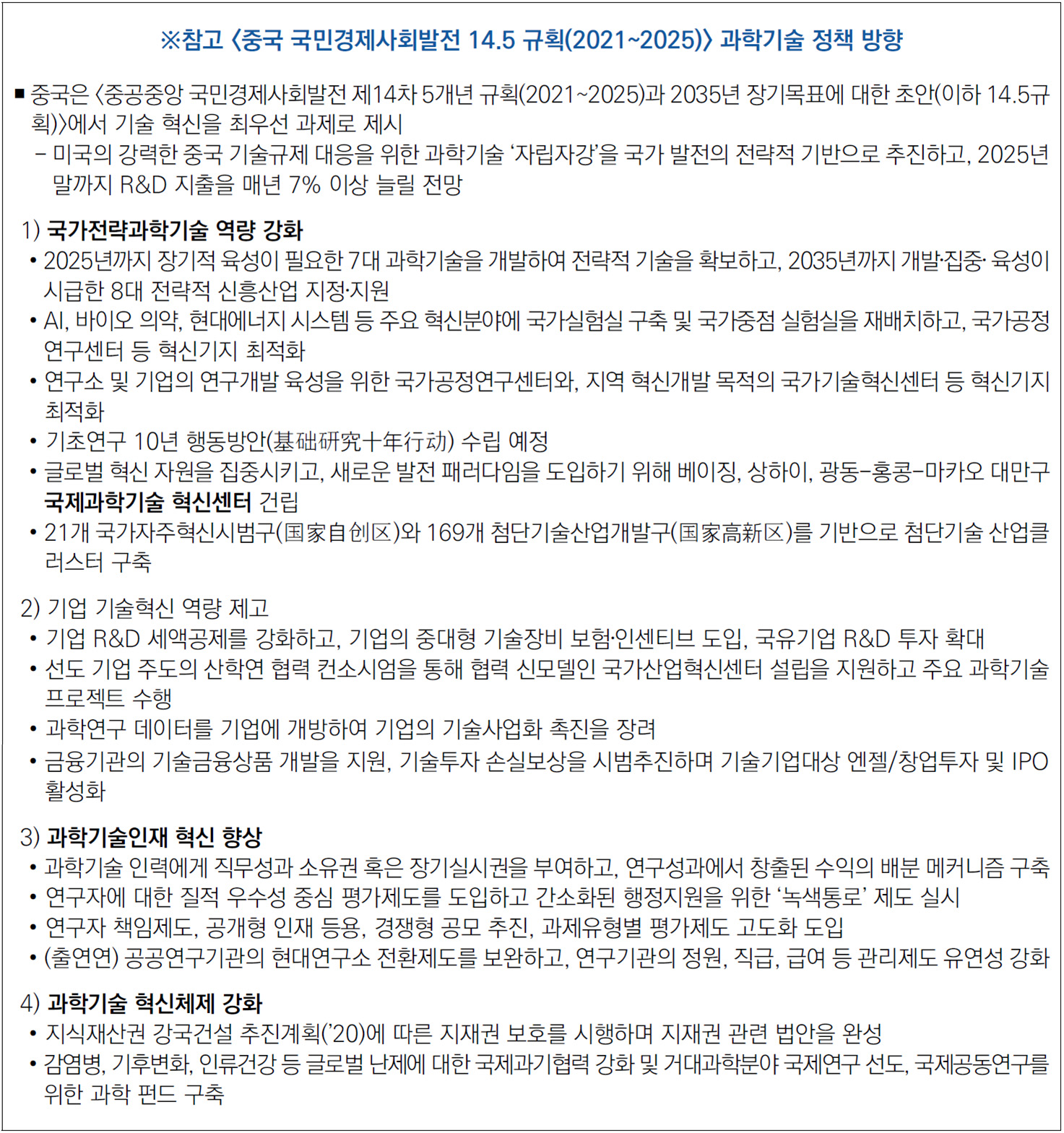 - 과학기술 혁신체계를 보완하고, 중국 현대화 건설사업의 ‘혁신’의 역할을 강화하여 ‘신형 거국체제(新型举国体制)*’구축