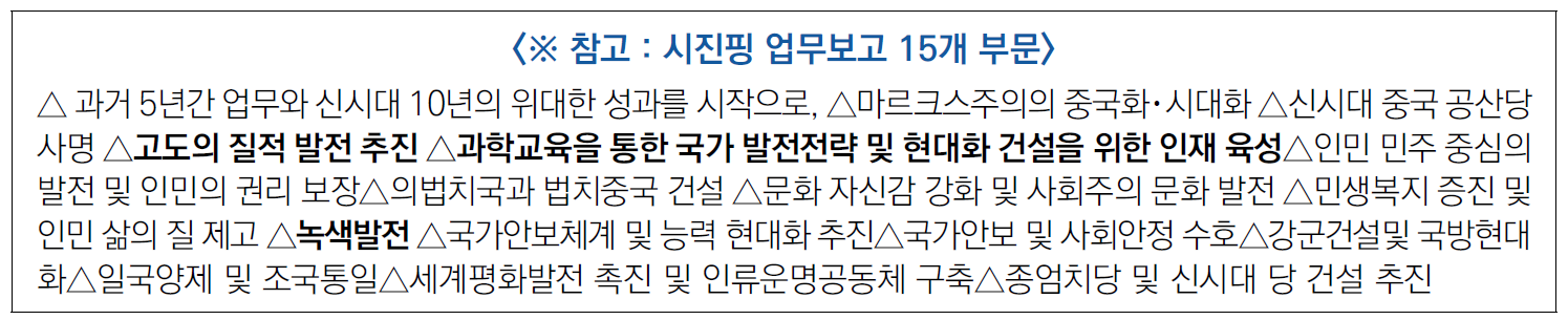 - 중국몽 실현을 위한 공동부유, 높은 수준의 사회주의 경제체제 구축 및 민영 경제 발전 지원 언급