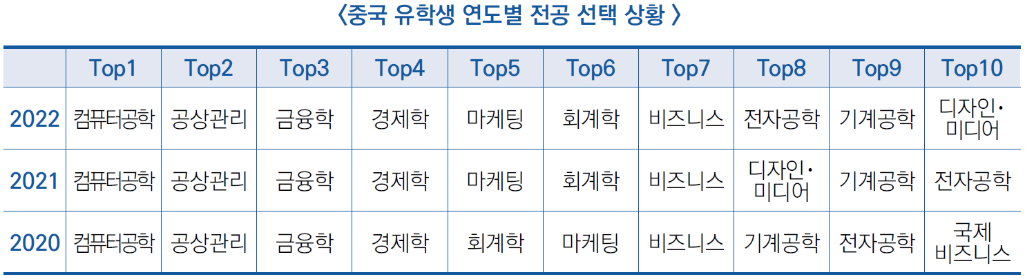 - 중국 유학생의 전공은 컴퓨터공학, 공상관리 및 금융학 순으로 많았고, 석사 이상이 전체의 1/2을 차지