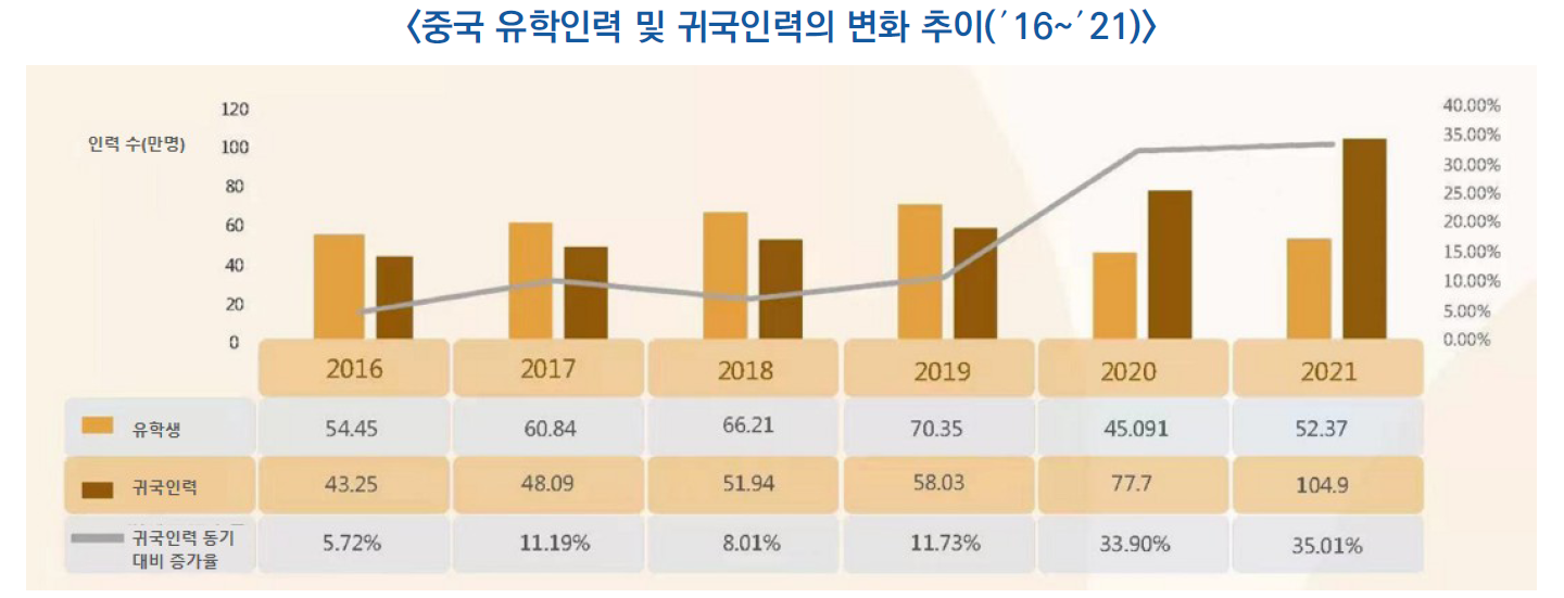 - ′20년도 귀국한 유학생 수는 77.7만명(33.9%↑), 21년도 귀국한 유학생 수는 104.9만명(35.1%↑)에 이르는 등 급속도로 증가
