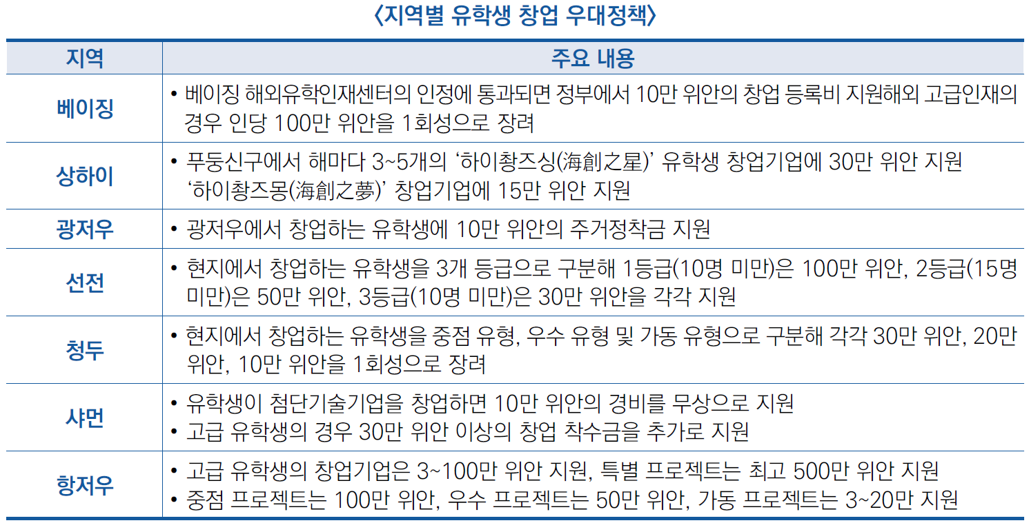 ![]() ○ 창업을 선택한 유학생은 전체의 5% 미만으로 비중이 적지만, 중앙과 지방 정부 차원에서 다양한 창업 지원 정책을 추진 중