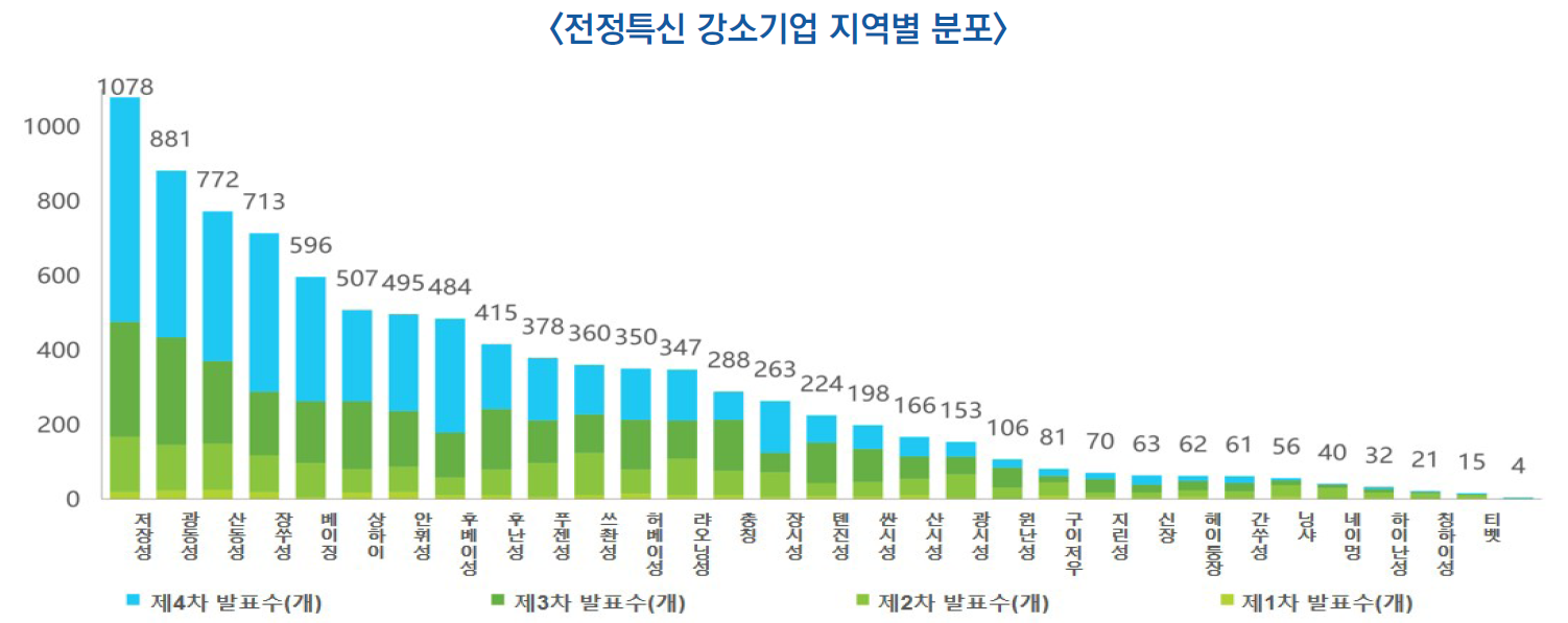 ![]() - 동부지역은 우수한 기술혁신 역량으로 전반적으로 많은 강소기업을 배출하였고, 중부지역은 기술밀집형의 제조업과 신흥산업 분야, 동북지역은 전통제조업 분야, 서부지역은 신에너지 분야에서 강점을 보이고 있음