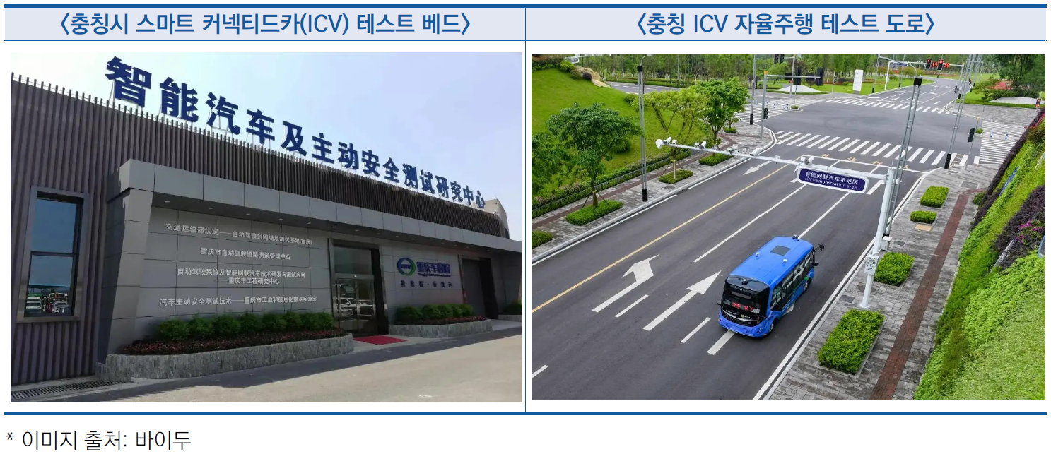 - 베이더우싱통(北斗星通), 중커촹다(中科創達) 등 지능형 네트워크 핵심 부품 기업 유치로 스마트 커넥티드카(ICV) 연구 센터(충칭), ICV 자율주행 시범지역 구축
