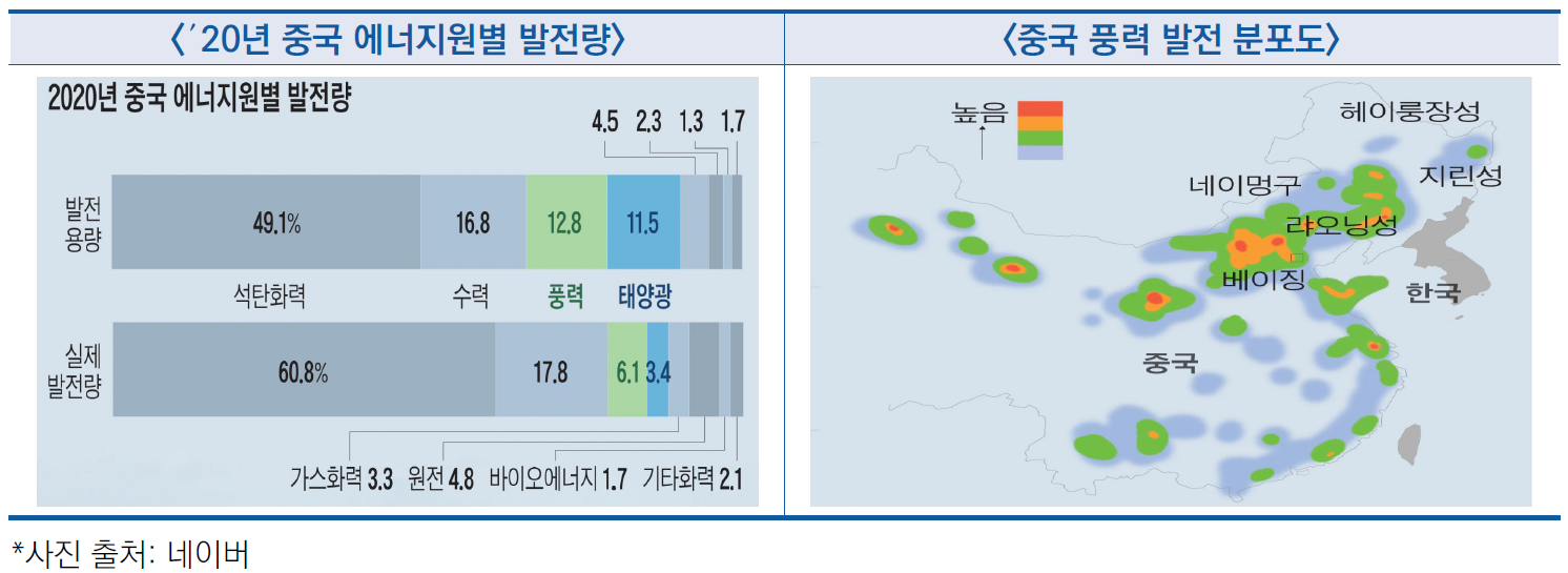 - ‘20년 기준, 중국 에너지원 발전용량은 석탄화력(59.1%), 수력(16.8%), 풍력(12.8%), 태양광(11.5%) 순의 비중으로 석탄 비중이 과반수 이상을 차지하여 이를 녹색 저탄소 전환이 시급