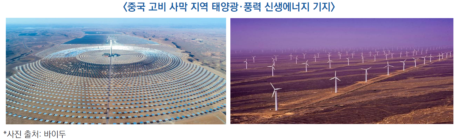 - 해상 풍력·태양광 발전 표준화 시범 프로젝트 건설, 고비 등 사막 지역 중심 대규모 풍력 및 태양광 기지 건설 추진