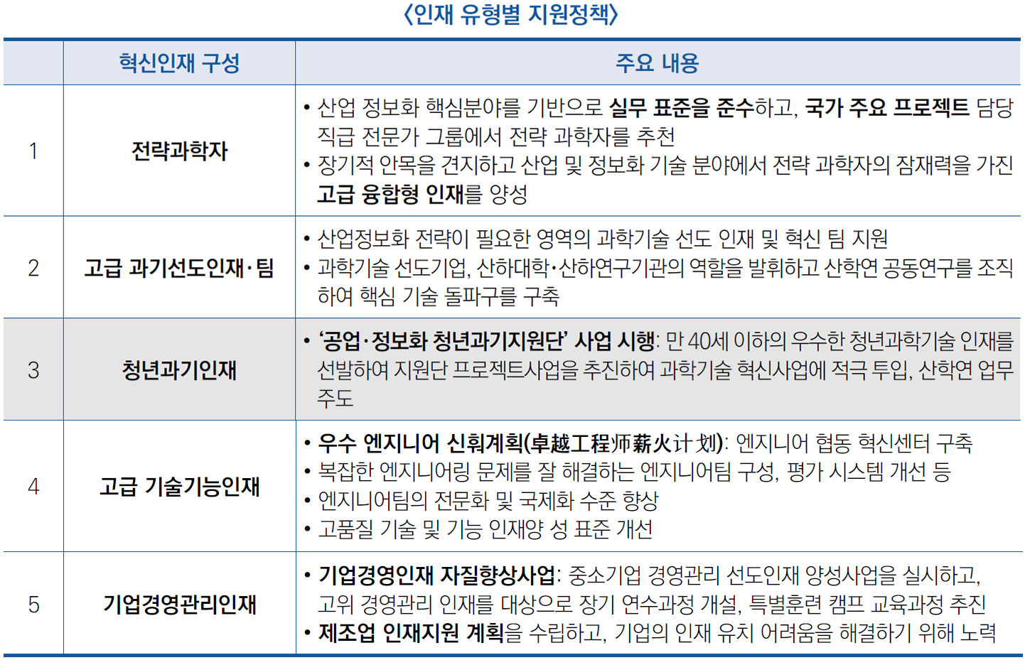 - 인재를 전략과학자, 고급과기선도인력, 청년과기인재, 고급기술자팀, 기업경영인재로 구분하여 세부적으로 지원하고 특히 청년과기인재 양성을 강화하여 인재의 주류로 지원