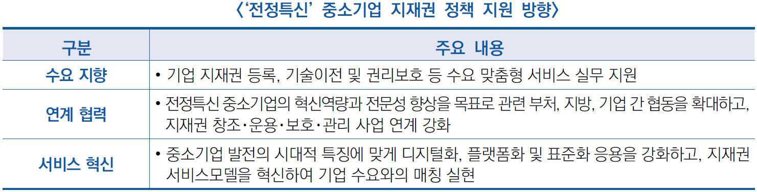 - 전정특신 등 중소기업 지재권 관리그룹을 육성하고, 지재권 서비스에 필요한 자금 및 정책 지원을 강화