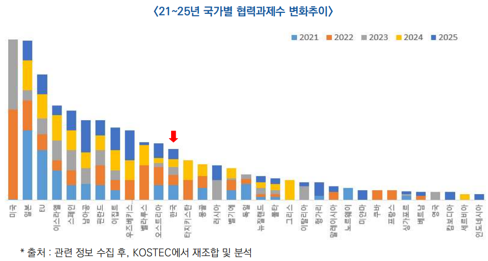* 한국은 초기 상위권에 속했으나, 해마다 과제 수가 점차 줄어들며 중위권으로 하락하는 상황