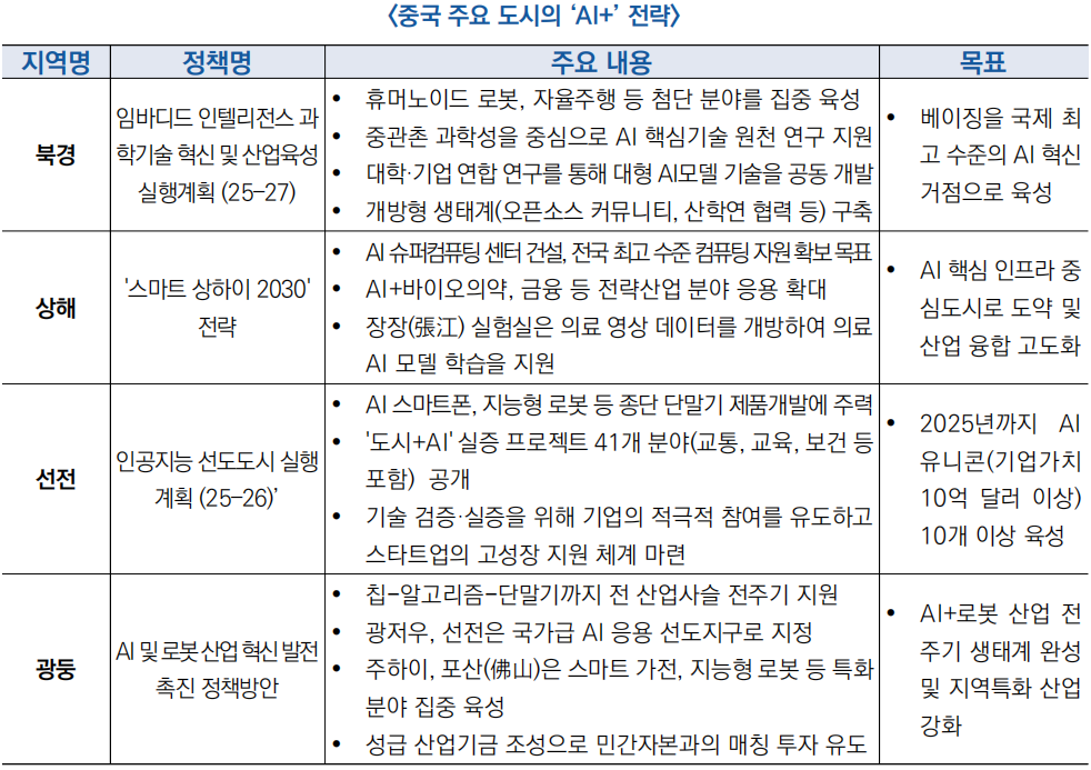 ![]() □ 중국 주요 도시들은 ‘AI+’ 전략을 중심으로 서로 다른 산업육성 방식에 집중하고 있음