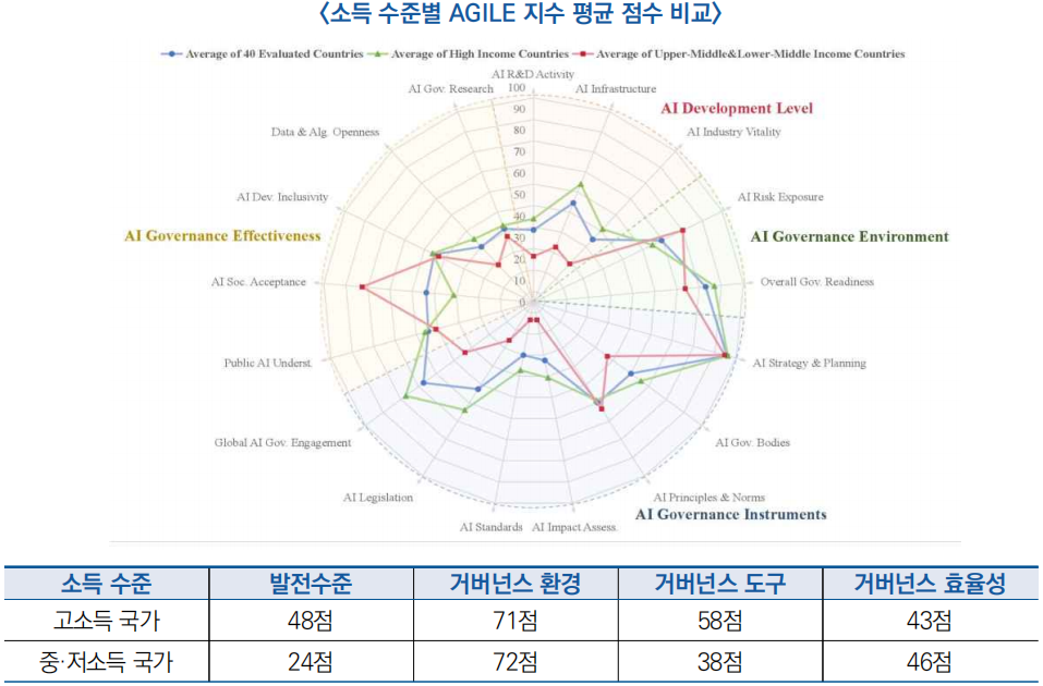 ![]() ○ (소득 수준별 특징) 40개 대상국을 ‘고소득 국가’와 ‘중·저소득 국가’로 구분할 경우, 고소득 국가는 AI 발전 수준과 AI 거버넌스 도구활용 능력에서 상대적으로 높은 점수를 기록