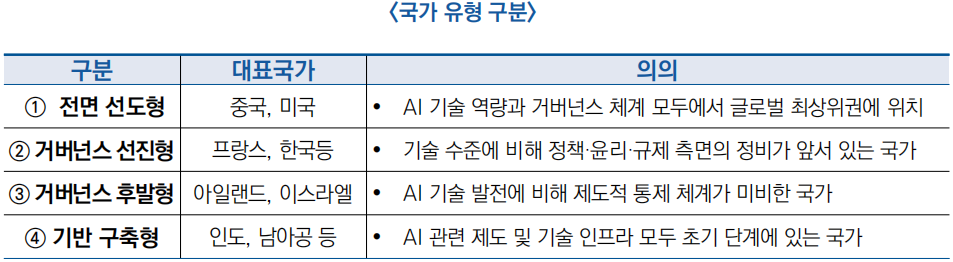 - 미·중은 전면 선도형에 해당되며 AI 기술 역량과 거버넌스 체계에서 글로벌 최상위권에 위치