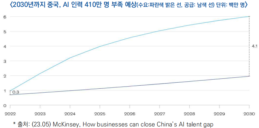 □ (수급 불균형) 맥킨지 보고서에 따르면, 2030년까지 중국의 AI 전문 인력 수요는 약 600만 명에 이를 것으로 전망되나, 최대 400만 명의 인력 부족이 발생할 것으로 예상됨