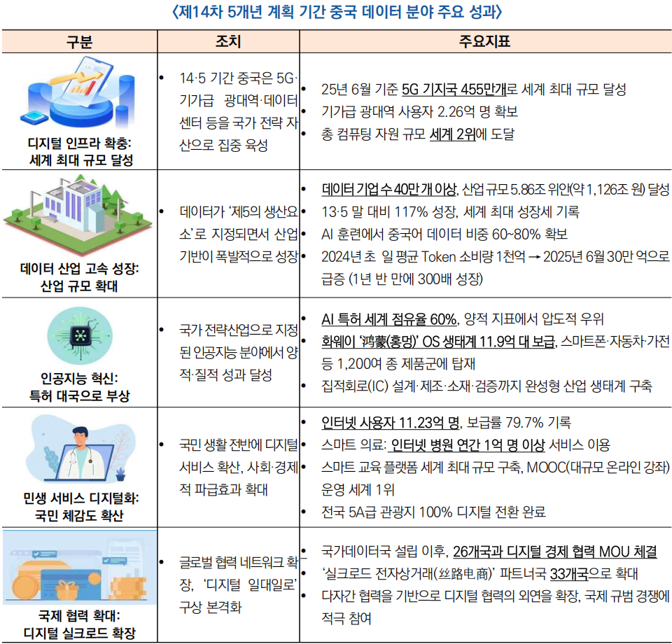 □ 중국 국가데이터국은 ‘제14차 5개년 계획(2021~2025)’ 기간 디지털 인프라, 데이터 산업, 인공지능, 민생 서비스, 국제협력 등에서 달성한 주요 성과를 발표(25.8.18)