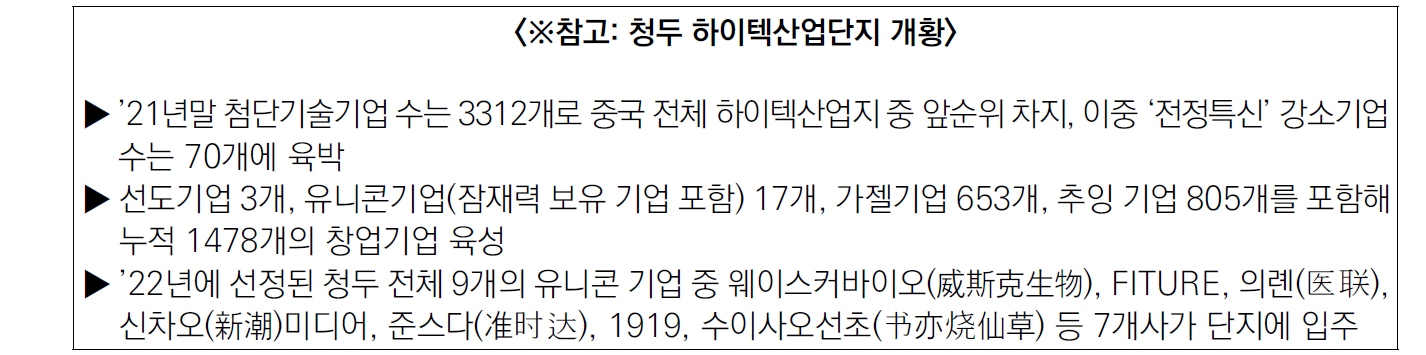 ○ 청두 하이테크산업 단지는 ‘PI-IP-IPO’ 기업 전체 생명주기 혁신체인을 구축하는 등 우수한 창업생태계를 조성