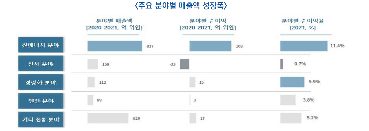 - 주요 분야별 매출액을 보면, 신에너지 분야 매출액이 가장 많았고, 전통전자 분야는 칩 공급 문제로 부진한 실적을 나타냄